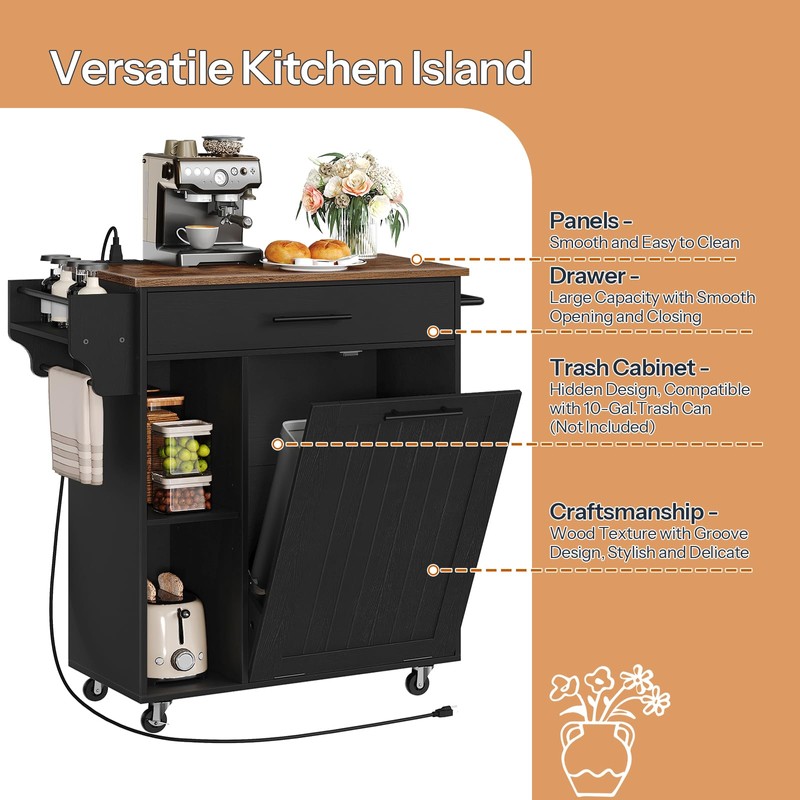 HOOBRO Kitchen Island with Trash Can Storage, Rolling Kitchen Island on Wheels, Mobile Island Cart with Power Outlet, Islands Table for 10 Gallon Garbage Bin, Rustic Brown and Black BF80UZD01G1