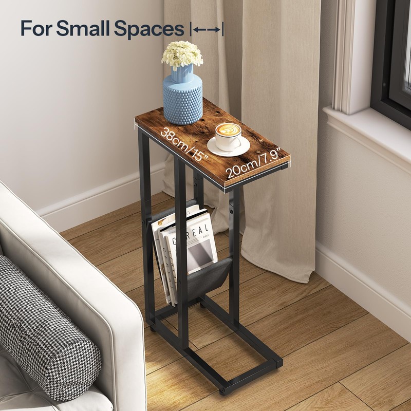 - C Table Design: Narrow and Tall Design. This C-shaped End Table with dimensions of 15"L x 7.9"W x 26.2"H, the top holds up to 44 lb, top surface scratch or stain resistant. This narrow side table is perfect for use as a sofa table, couch table or TV tray table for small space in the living room, bedroom, or balcony, enough to hold your laptop, coffee and snacks, satisfy your different needs