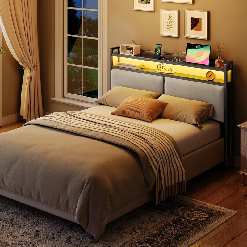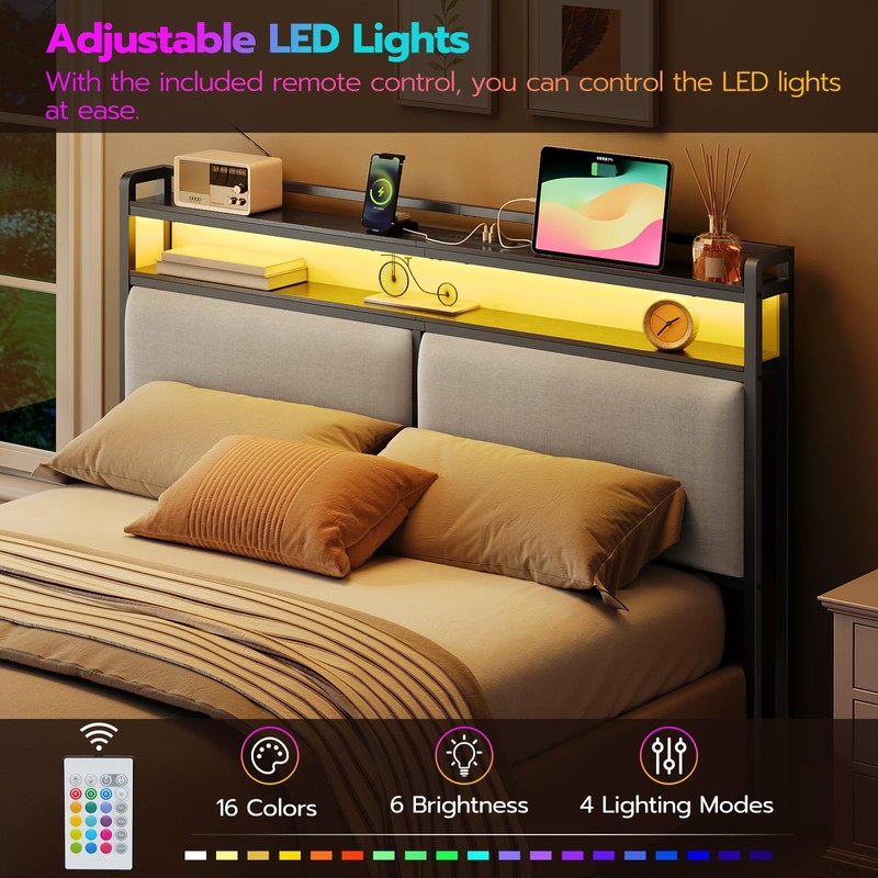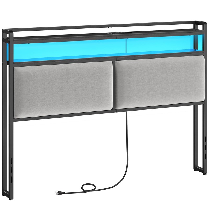 HOOBRO Queen Size Upholstered Headboard, Storage Headboard with Charging Station and Adjustable LED Lights, 2 Standard Outlets and 2 USB Ports, Queen Headboard Only, Easy Assembly, Black and Gray