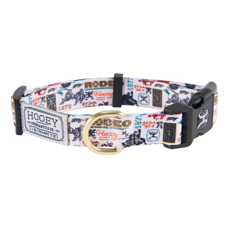 - DURABLE HARDWARE: Plastic side release buckle closure with Hooey emblem, plastic hardware and strap keeper, metal D-ring for dog tags, HD mercantile style woven Hooey label