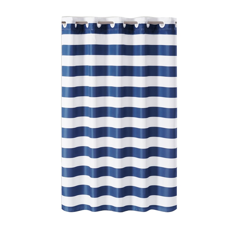 - DURABLE & CONVENIENT – Enhance your bathroom decor effortlessly with the sleek & modern look of the Hookless Cabana Stripe Shower Curtain. This 3-in-1 shower curtain set features a shower curtain, It’s A Snap! Liner, and Flex-On rings for easy installation