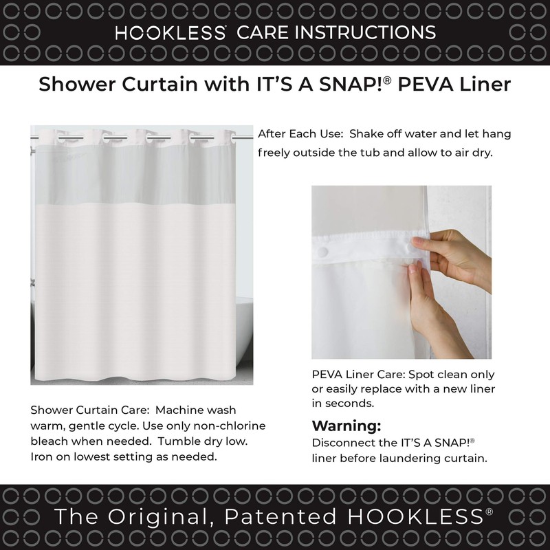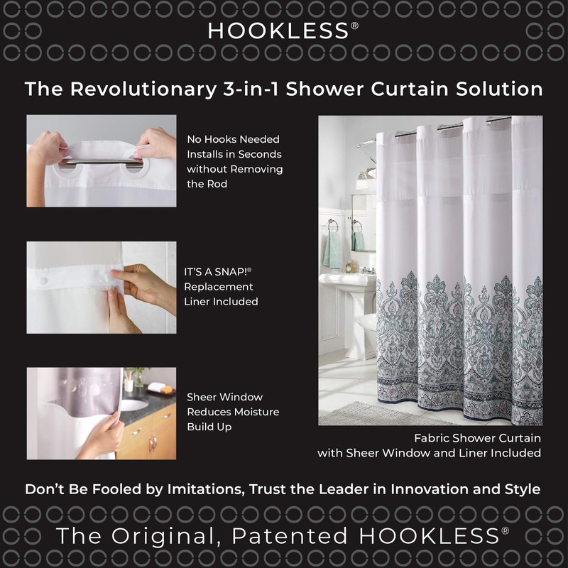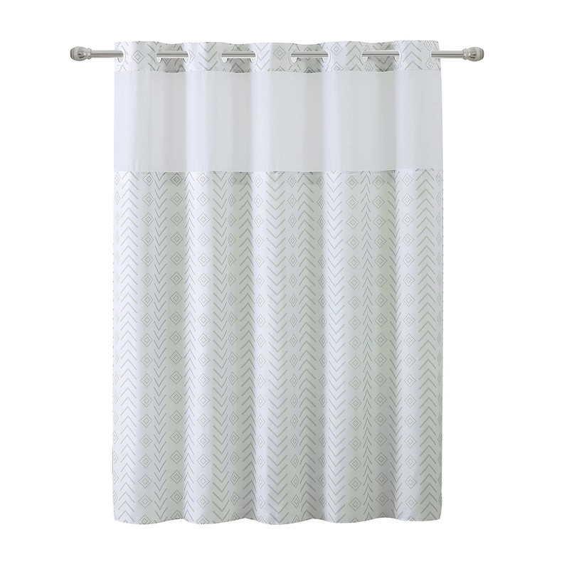- 3 in 1 shower curtain construction with built-in liner and rings