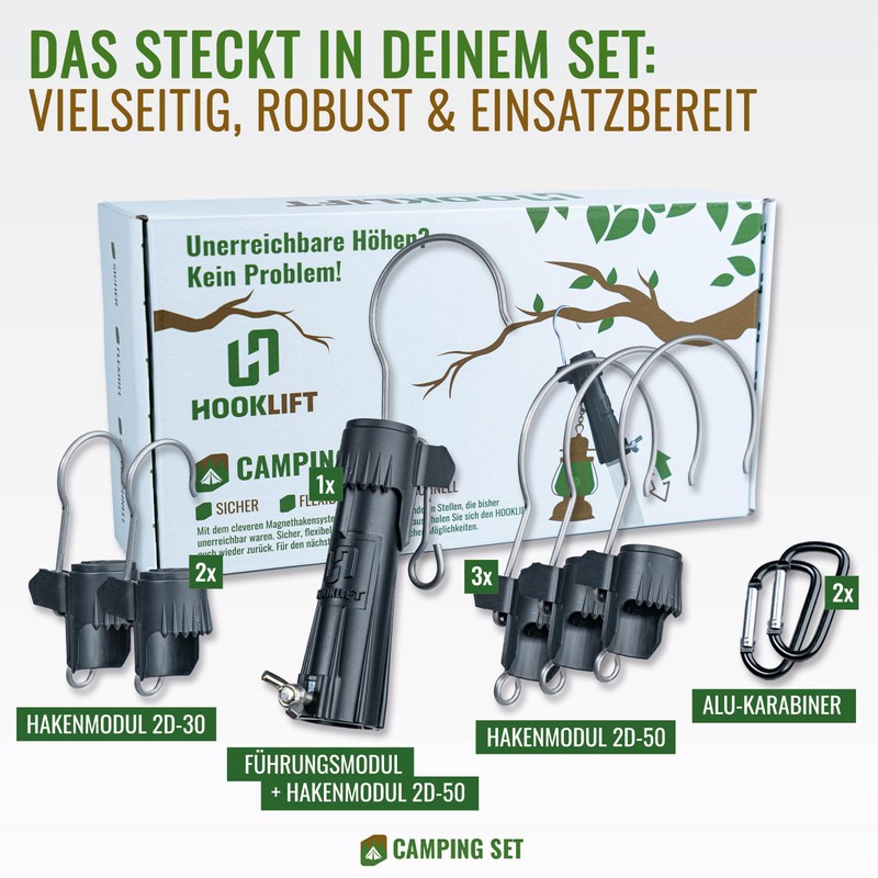 - The ideal tool/gift for any camper. Simply leave your awnings, fairy lights, lanterns, water showers, etc. e.g. hang from the tree. Safe, flexible, super fast with the Hooklift camping set