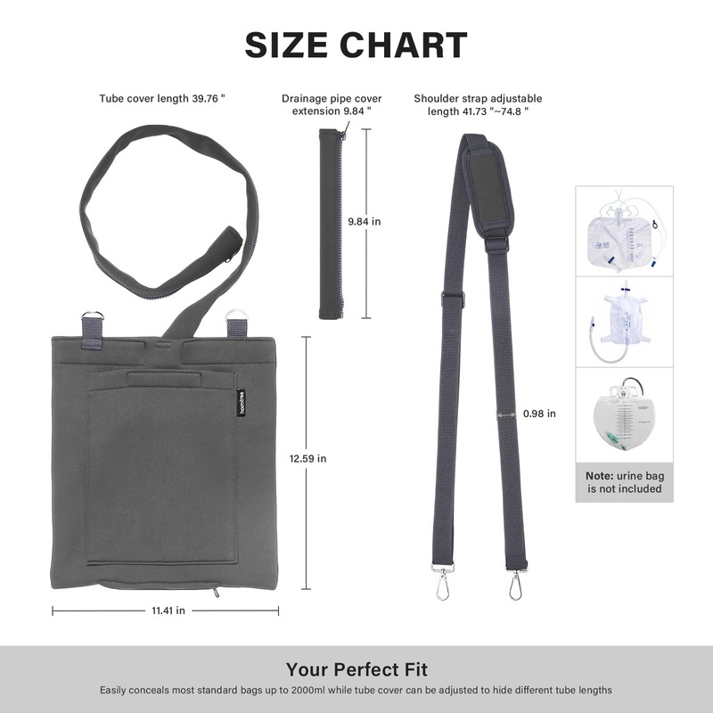 Easily conceals most standard bags up to 2000ml while tube cover can be adjusted to hide different tube lengths