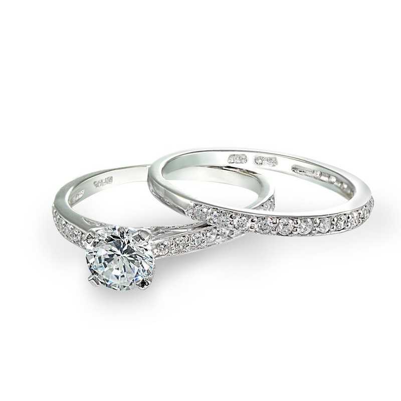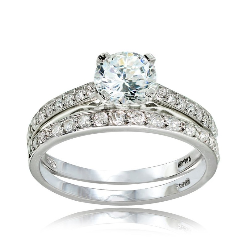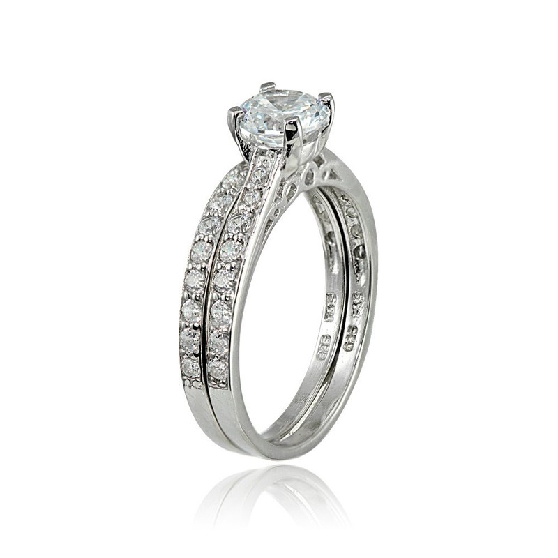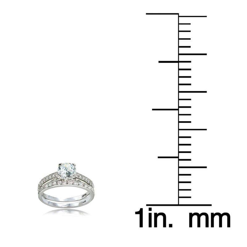 • Ring set features a wedding band with a seamless semi row of round-cut cubic zirconias and an engagement ring with a round-cut cubic zirconia center stone and shoulder accents.