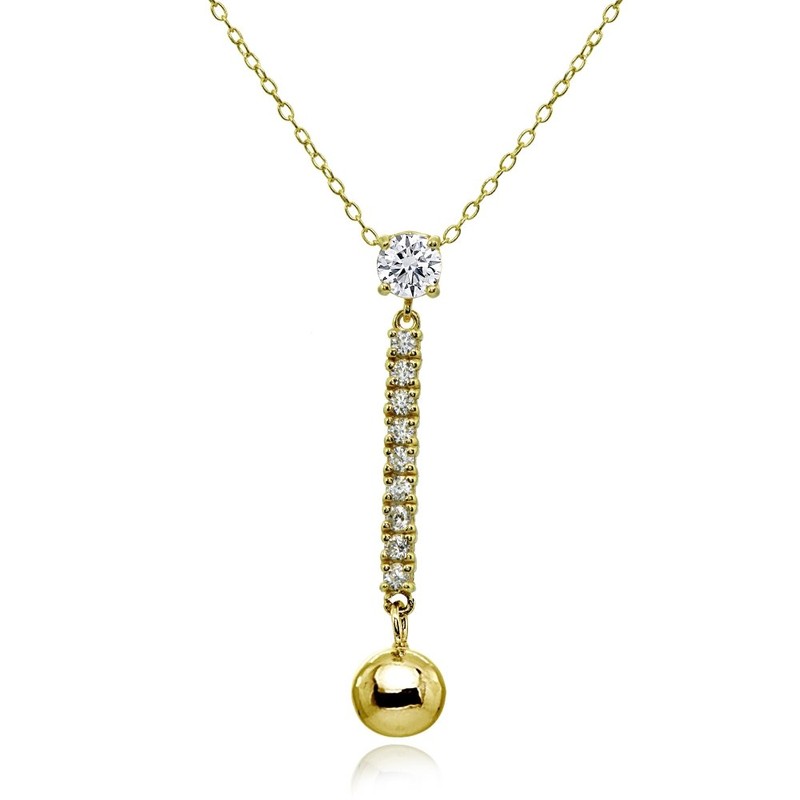 - This necklace is the perfect addition to your sterling silver jewelry and can be purchased as necklaces for women and necklaces for teen girls. This beautiful necklace displays a polished bead connected to a CZ encrusted bar dangling from a 5mm cubic zirconia stone. It is made of yellow gold flashed .925 sterling silver and is nickel free. The necklace measures 18 inches and secures by a spring-ring clasp.