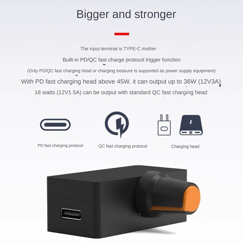 - Built-in PD/QC fast charging protocol trigger (only supports PD/OC fast charging charging or power bank as power supply device)