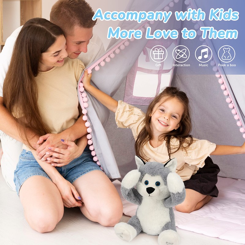 - Lo que lo hace: nuestro husky peek a boo está hecho de materiales 100% naturales y respetuosos con el medio ambiente, como algodón PP y felpa suave. Los padres no necesitan preocuparse de que el juguete interactivo raye la piel de los niños pequeños. Mientras tanto, sus ojos están cosidos de forma segura y los niños no los tiran fácilmente. Incluso ahora, sugerimos que los niños menores de 6 años jueguen con él bajo supervisión para una mejor experiencia.