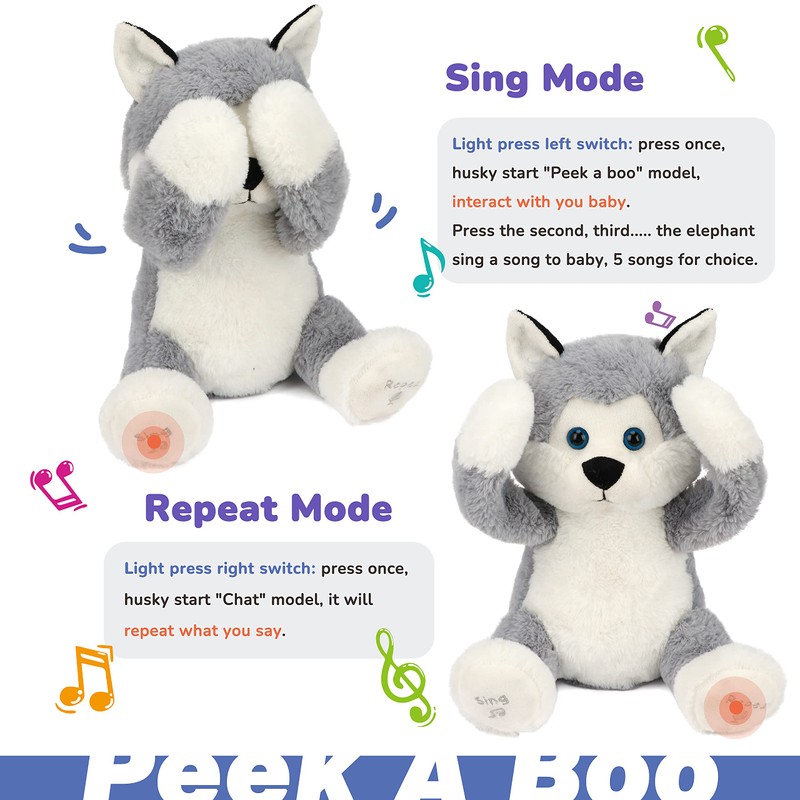 - Figura adorable: este juguete de peluche animado es un lindo y peludo husky. Cuando presionas el botón izquierdo, dirá "Peek-a-Boo" y cantar canciones, puedes presionar el botón para cambiar (concluyen 5 canciones). Pulsa el botón derecho, repetirá lo que decir. Mientras tanto, puede hacer adorables movimientos de mano Peek-A-Boo mientras cantas o hablas.