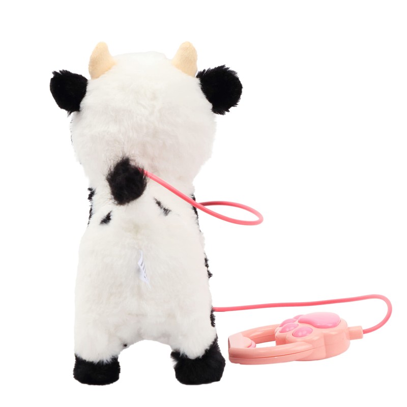 - SINGING AND WALKING: This is a vivacious cow led by a leash, it features with barking and walking. When you touch its head, it will moo to you, it’s a cow like purring. If you try to press the switch on the leash, you will find it will sing and walk to you, press again, it will stop, again, it will change to another song. It contains 10 songs in total. It is a good cow to make your child happy after opening switch.