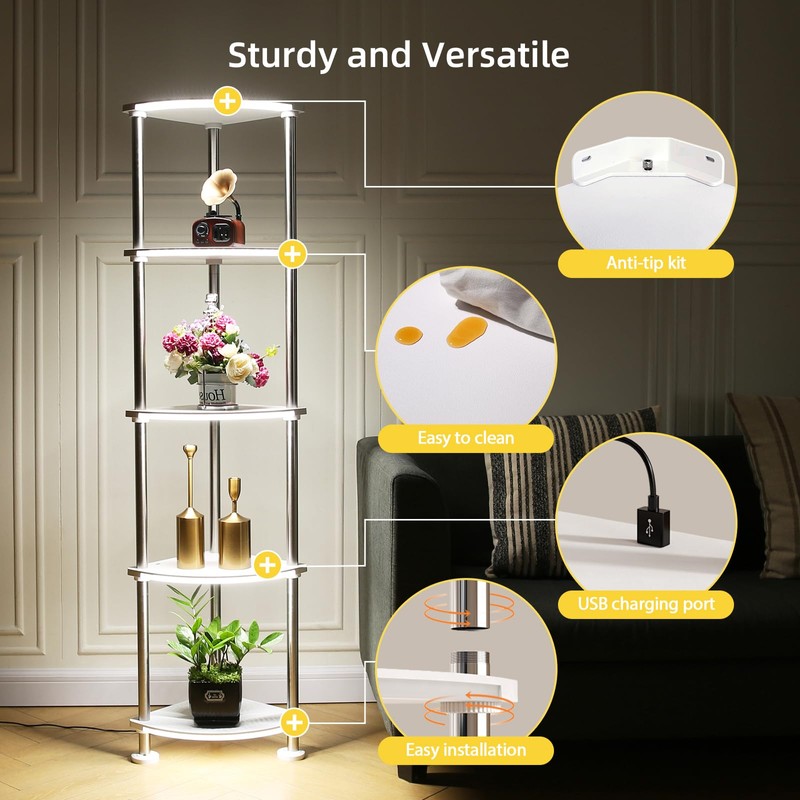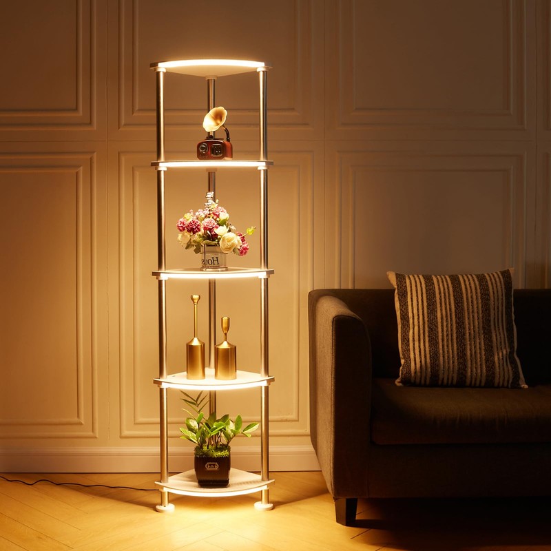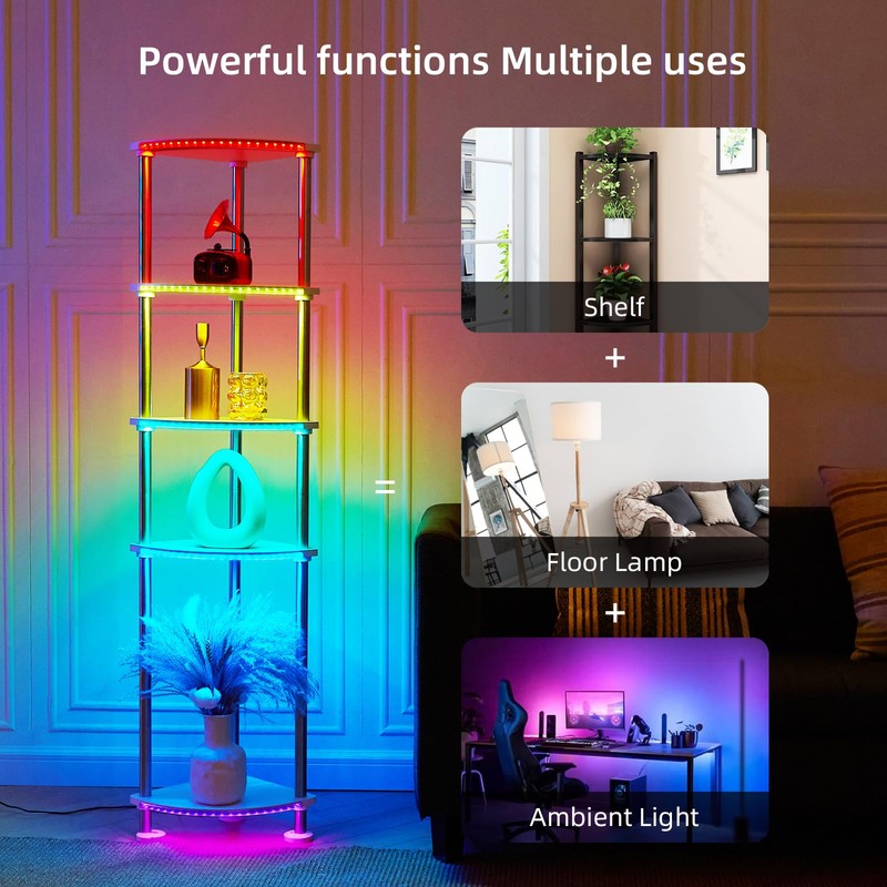 - Unique Design: The shelf floor lamp cleverly integrates color-changing lighting, storage, display and charging functions. The spacious 5 floors help you display and store decorations in a simple and orderly manner. One lamp is multi-purpose, saving money and space, suitable for living room, bedroom, children's room, office, etc. to enhance your room decor