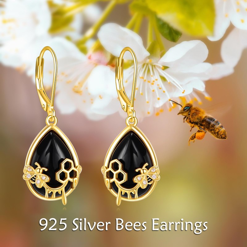 HOPEEZZ Bee Earrings For Women Sterling Silver Black Onyx Leverback Earrings Black Onyx Jewelry Bee Gift for Women (bee-black onyx)