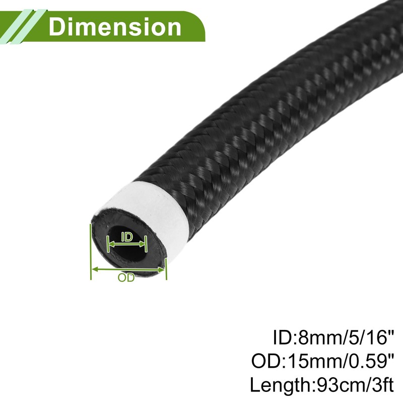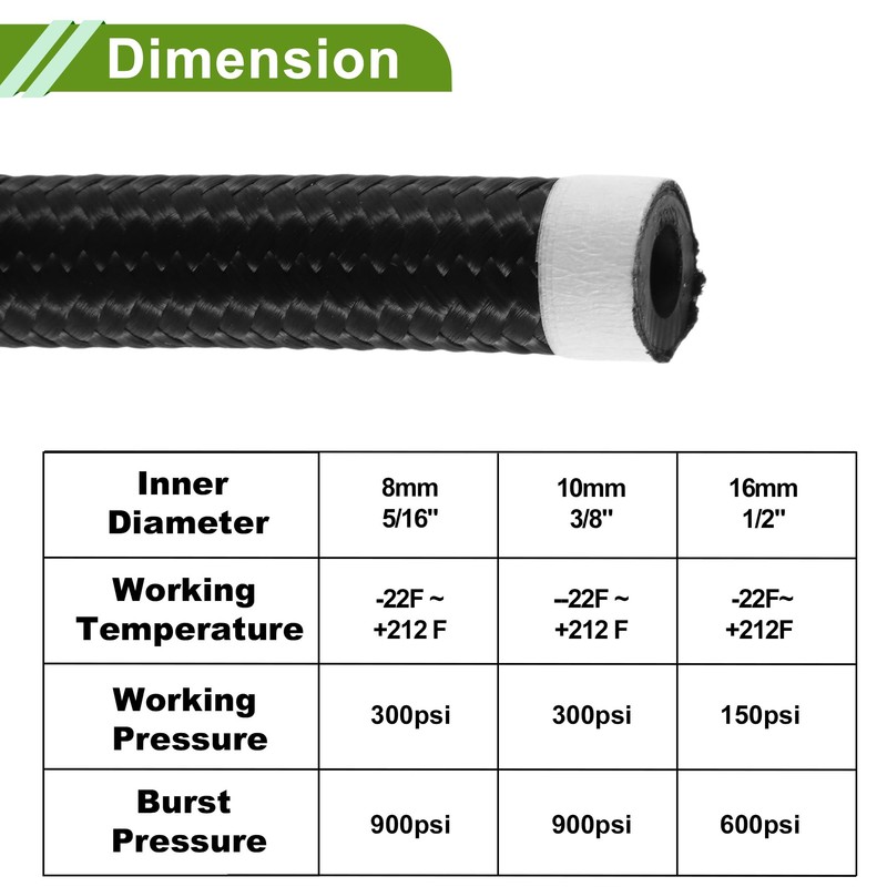 - Application:Length:93cm/3ft; Hose Inner Diameter:8mm/5/16"; Hose Outer Diameter:15mm/0.59"; Pressure Rating: Working pressure:300psi; Burst pressure:900psi; Temperature Range:-22F ~ +212 F