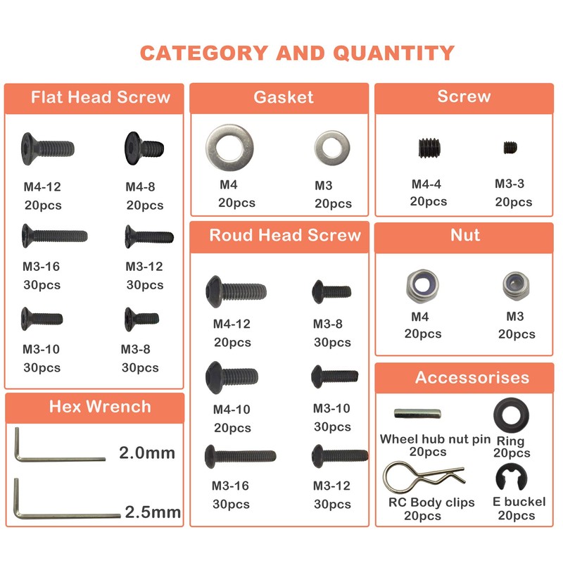 • 【Package Content】: M3 & M4 screws (flat head & round head), M3 & M4 nuts and gaskets, 2x10mm wheel hub nut pins, O ring, M2.5 E buckle and rc body clips, 522pcs totally