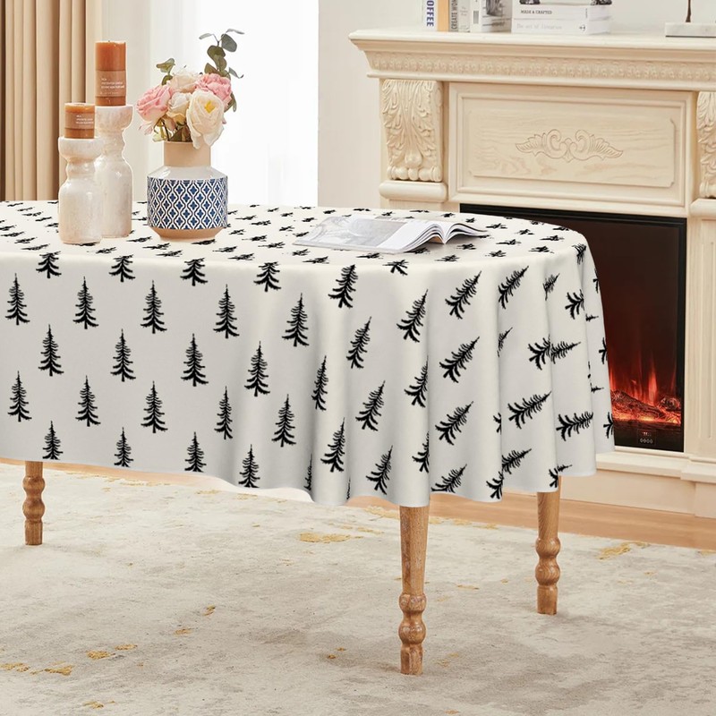 Horaldaily Christmas Tablecloth 60×84 Inch Oval, Trees Black White Boho Washable Table Cover for Party Picnic Dinner Decor
