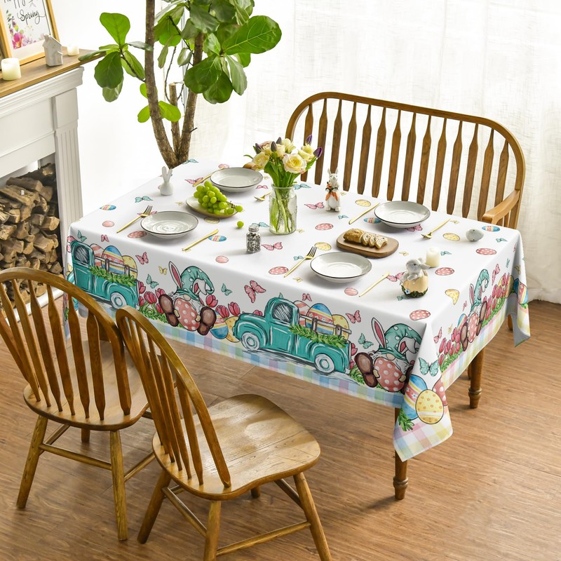 Horaldaily Easter Tablecloth 60×104 Inch, Truck Gnome Easter Eggs Washable Table Cover for Party Picnic Dinner Decor