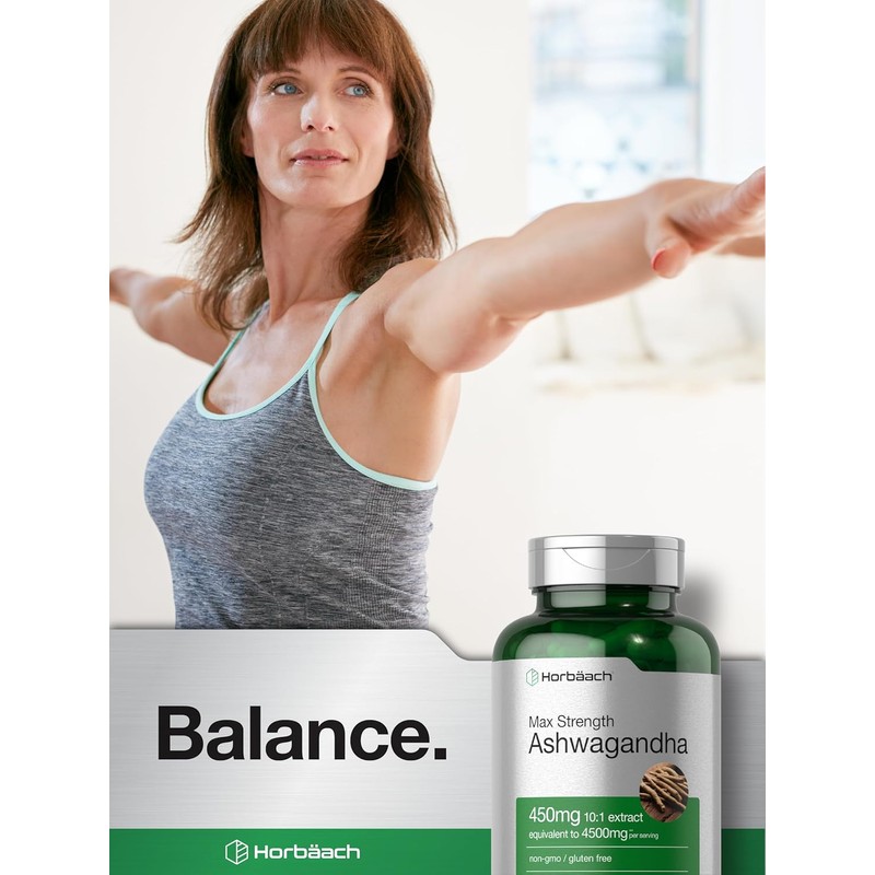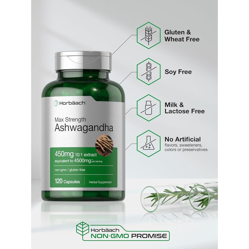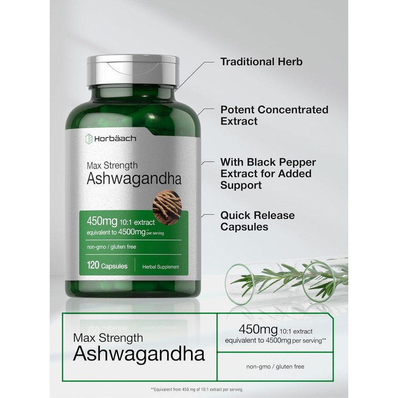 Horbäach Ashwagandha Supplement | Max Strength | 120 Capsules | Non-GMO, Gluten Free