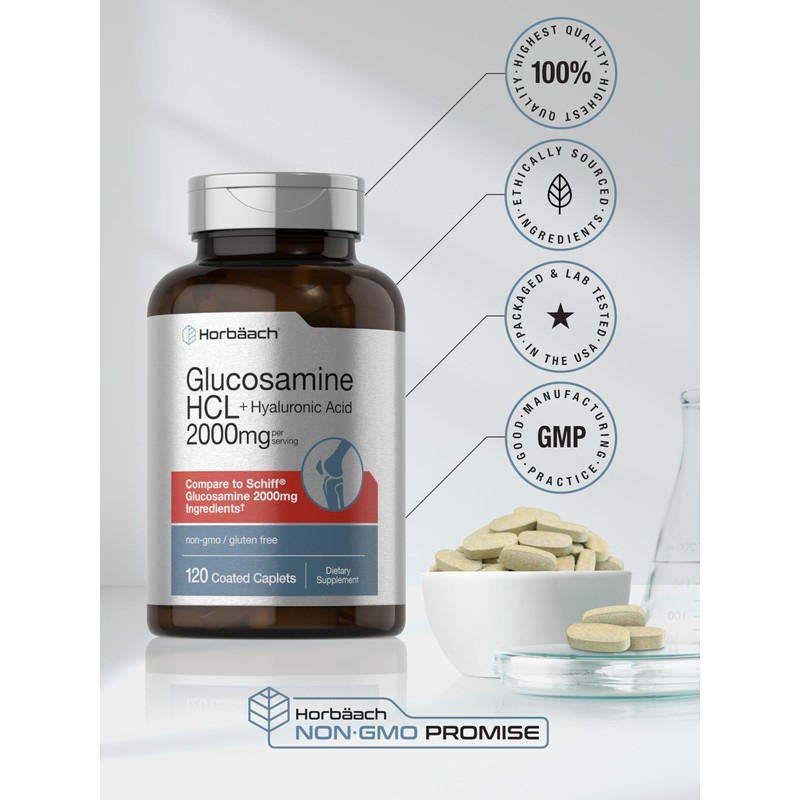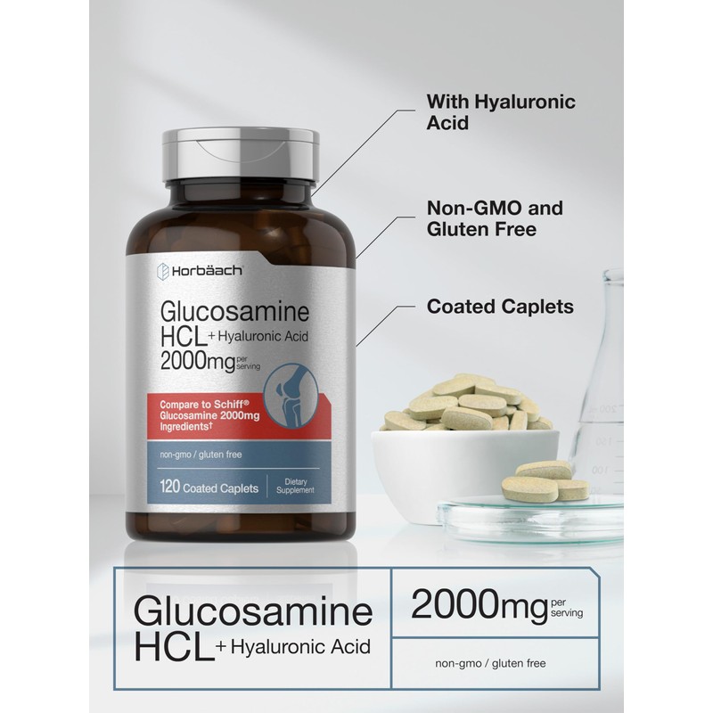 Horbäach Glucosamine HCL | with Hyaluronic Acid | 2000mg | 120 Coated Caplets | Non-GMO & Gluten Free Supplement
