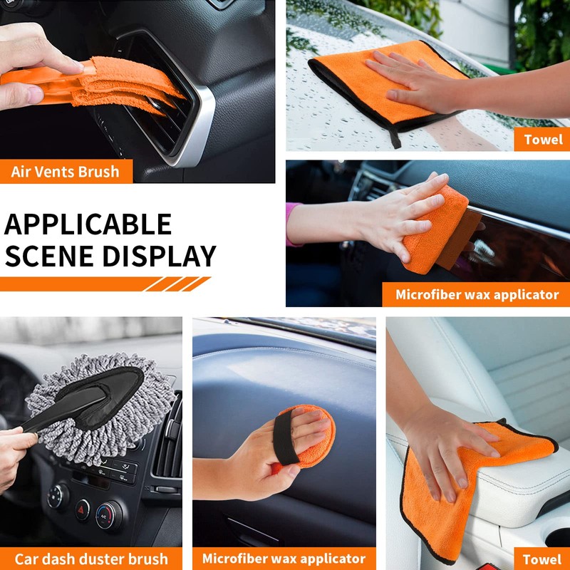 - 【INTERIOR & EXTERIOR CLEANING】Car dashboard dust brush and air outlet brushes can be used with car vacuum cleaner to remove dust from the surface of the car.Car wax applicator with car wash microfiber towels, can polish your car well to avoid scratches.Car windshield cleaning tool is convenient for cleaning the bottom of the window or some difficult-to-clean areas. 5 different sizes of premium detail brushes make it easy to explore tight spaces, lug nuts and any other hard-to-reach areas.