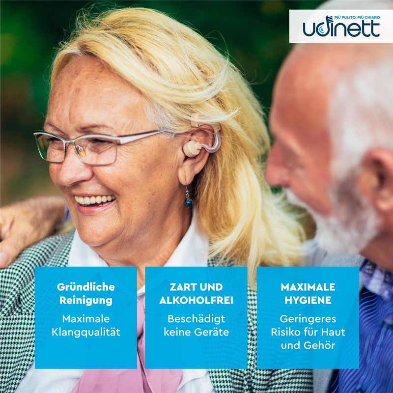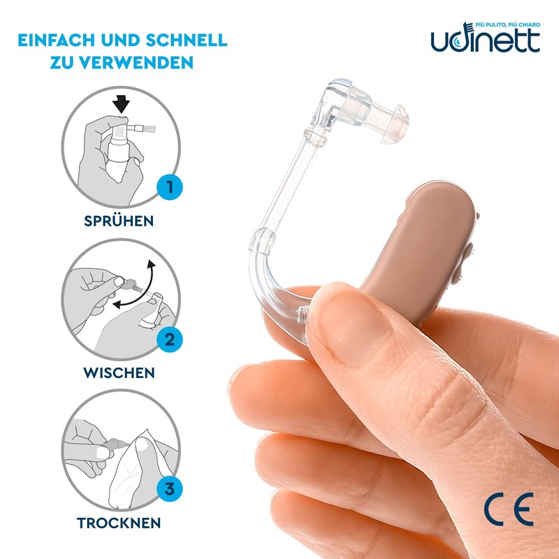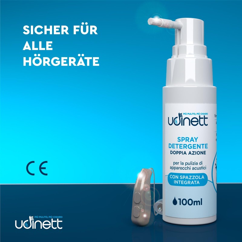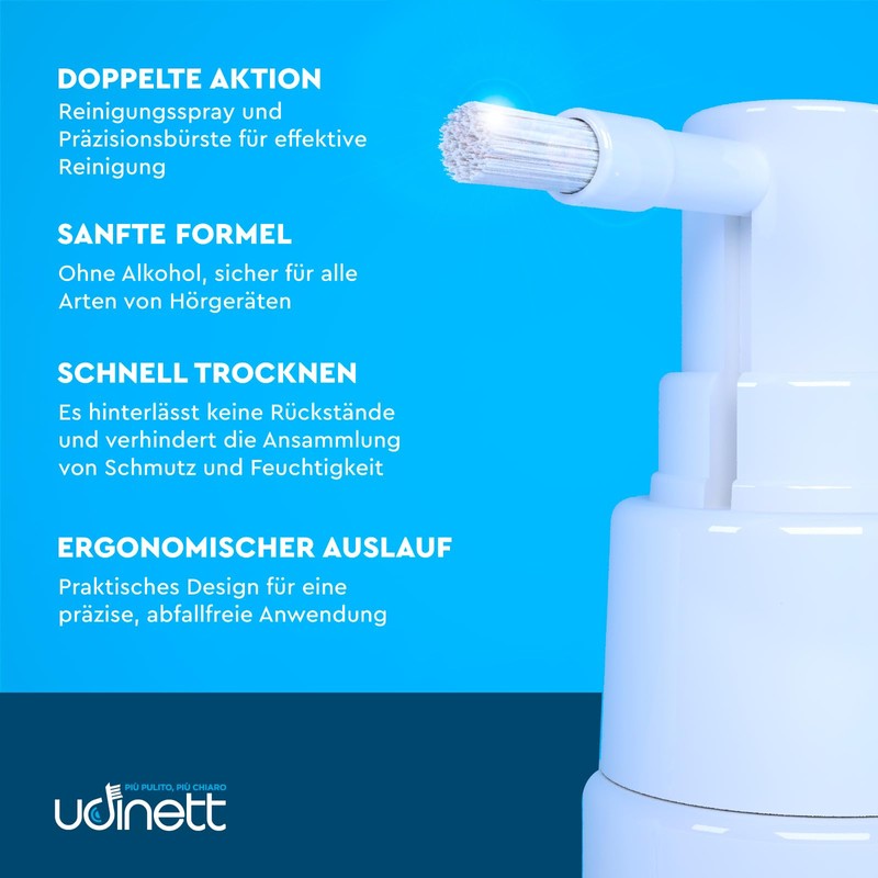 - 🦻🏻 1 Flasche 100ml Udinett-Hörgeräte-Reinigungsspray. Integrierte Bürste für die effektive tägliche Reinigung