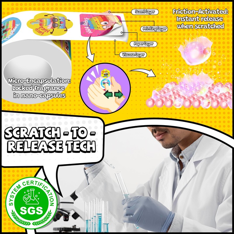 • Instant 4-Fruit Fragrance: Each roll smelly stickers features unique scents (Pineapple/Cola/Fruit/Vanilla). Unbox to release fresh aroma—gently rub scented stickers to intensify fragrance for a sensory delight!