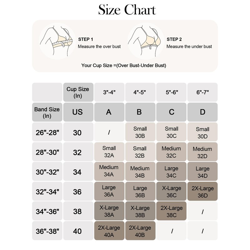 - Size Chart: S(30B, 30C, 30D, 32A, 32B); M(32C, 32D, 34A, 34B); L(34C, 34D, 36A, 36B); XL(36C, 38A, 38B); 2XL(36D, 38C, 40A, 40B). Our bras for women wirefree has the right amount of stretch to fit most women's body type