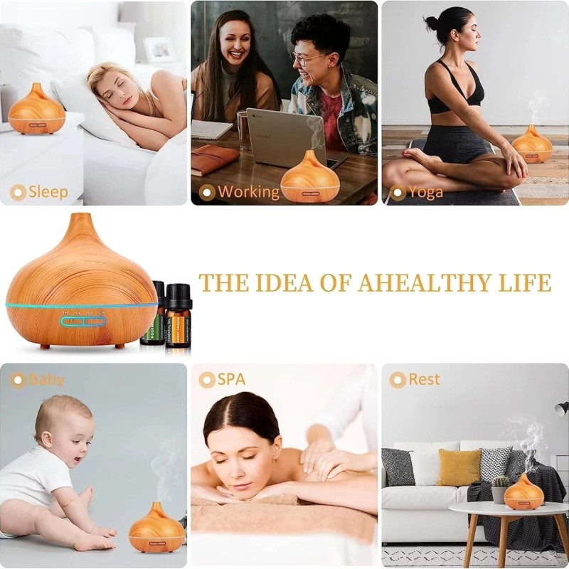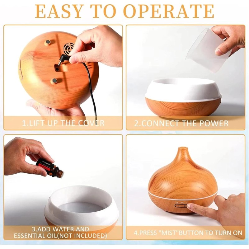 • 🧘 Compact, Stylish & Easy to Use – 200ml capacity lasts up to 10 hours. Sleek wood-grain design complements any décor. One-touch buttons for mist and light control.