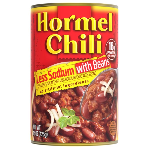 HORMEL Chili With Beans, Less Sodium, (Pack of 12), 15 oz Canned Chili, – 16g Protein per Serving, Gluten-Free - Great for Bowls, Dips, Hot Dogs and Appetitizers