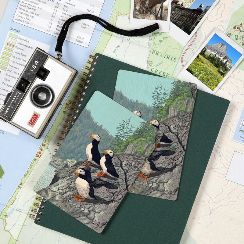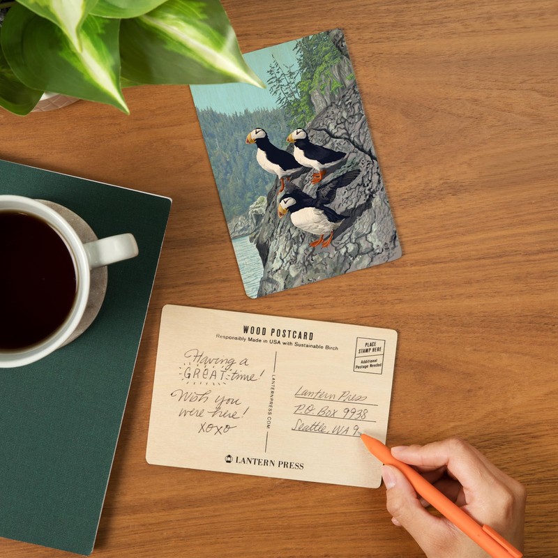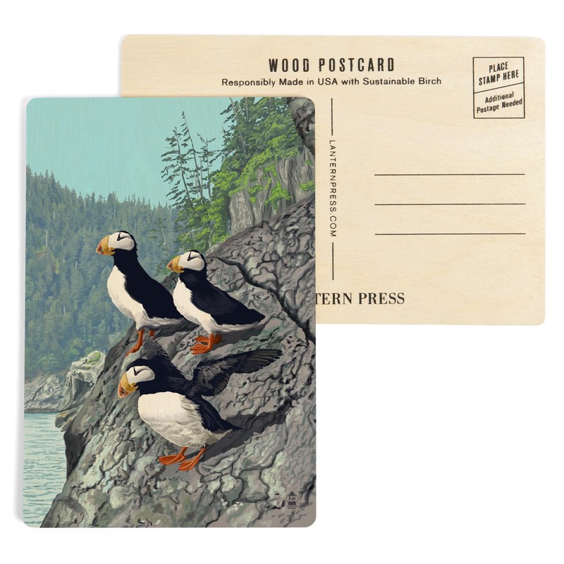 - Horned Puffins (4x6 Birch Wood Postcards, 2-Pack Stationary, Rustic Home Wall Decor), high-quality sustainable wood printed in Seattle