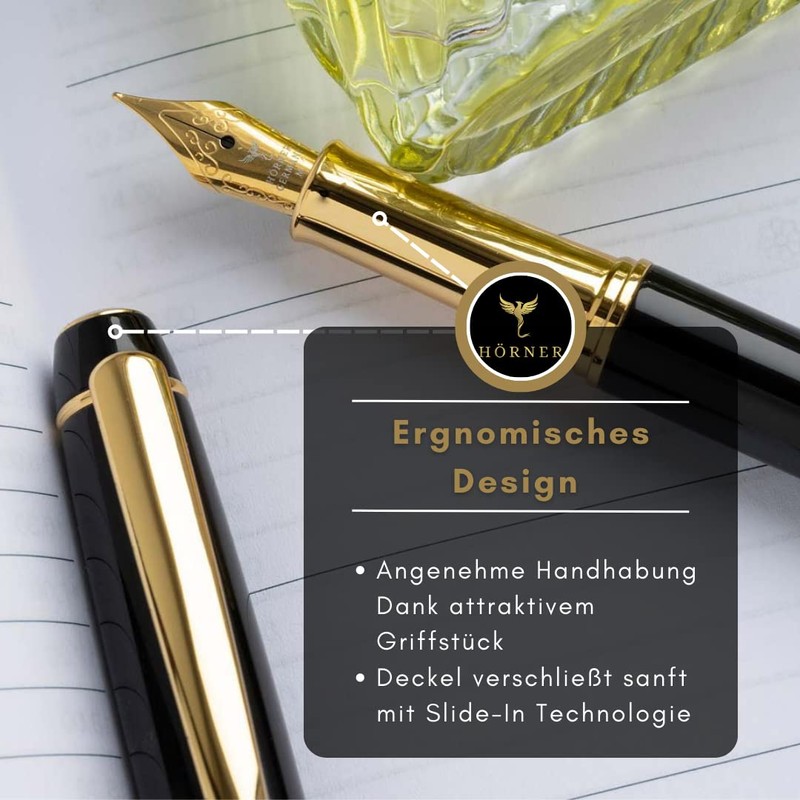 - The Hörner Nobilis Design fountain pen is an elegant and functional writing instrument. With its elegant black and gold finish, it is a real eye-catcher on any desk.