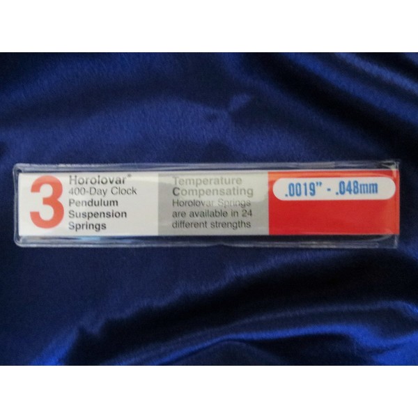 One 3 pack of .0019" - .048mm thick Horolovar 400-Day Clock Temperature Compensating Pendulum Suspension Springs. Each spring is 5-3/8" long.