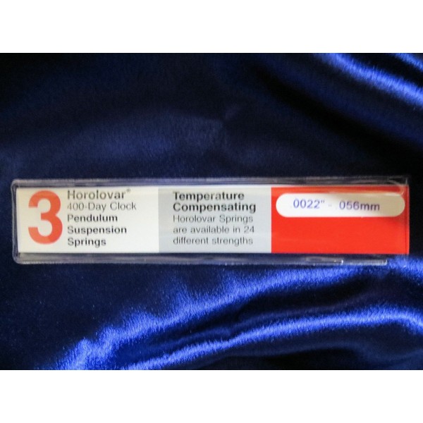 One 3 pack of .0022" - .056mm thick Horolovar 400-Day Clock Temperature Compensating Pendulum Suspension Springs. Each spring is 5-3/8" long.