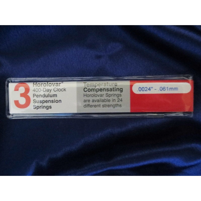 One 3 pack of .0024" - .061mm thick Horolovar 400-Day Clock Temperature Compensating Pendulum Suspension Springs. Each spring is 5-3/8" long.