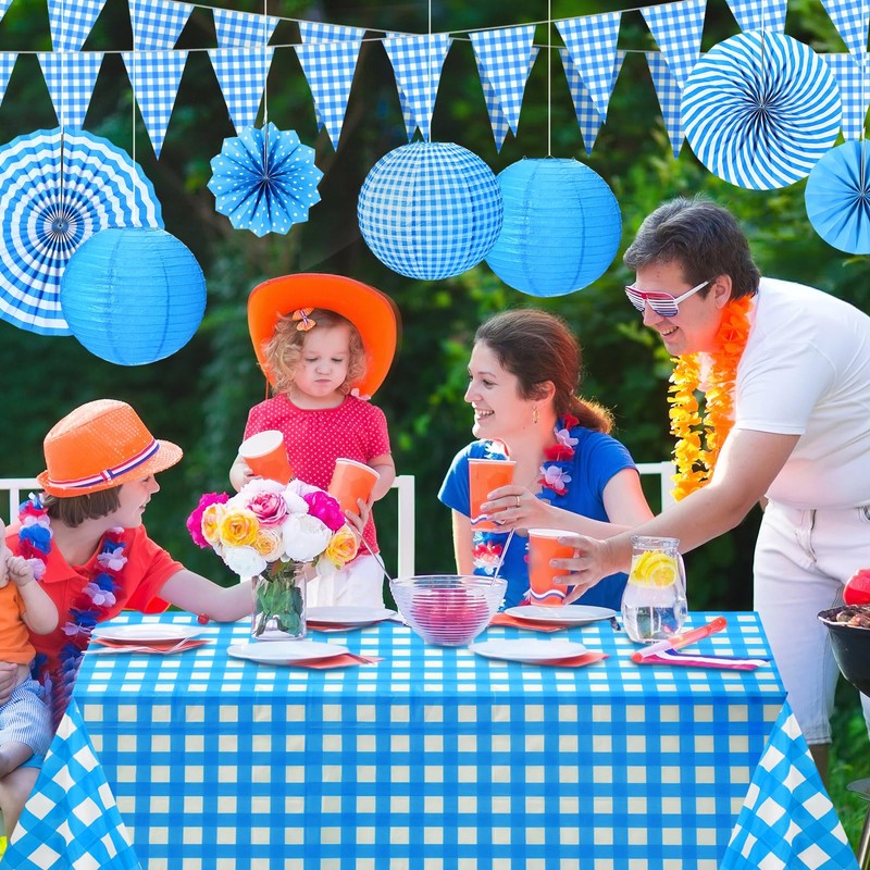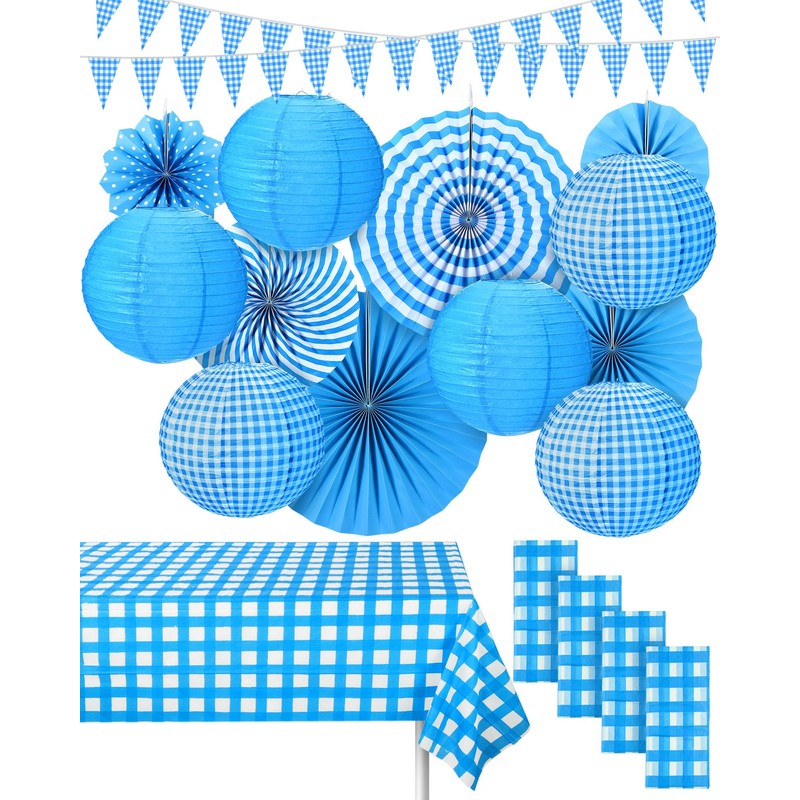 Hortsun 18 Pcs Blue Gingham Party Supplies Include Checkered Pennant Banner Hanging Paper Fans Round Lanterns Plastic Disposable Tablecloth for Baby Shower Wedding Birthday Party Family Dinner BBQ