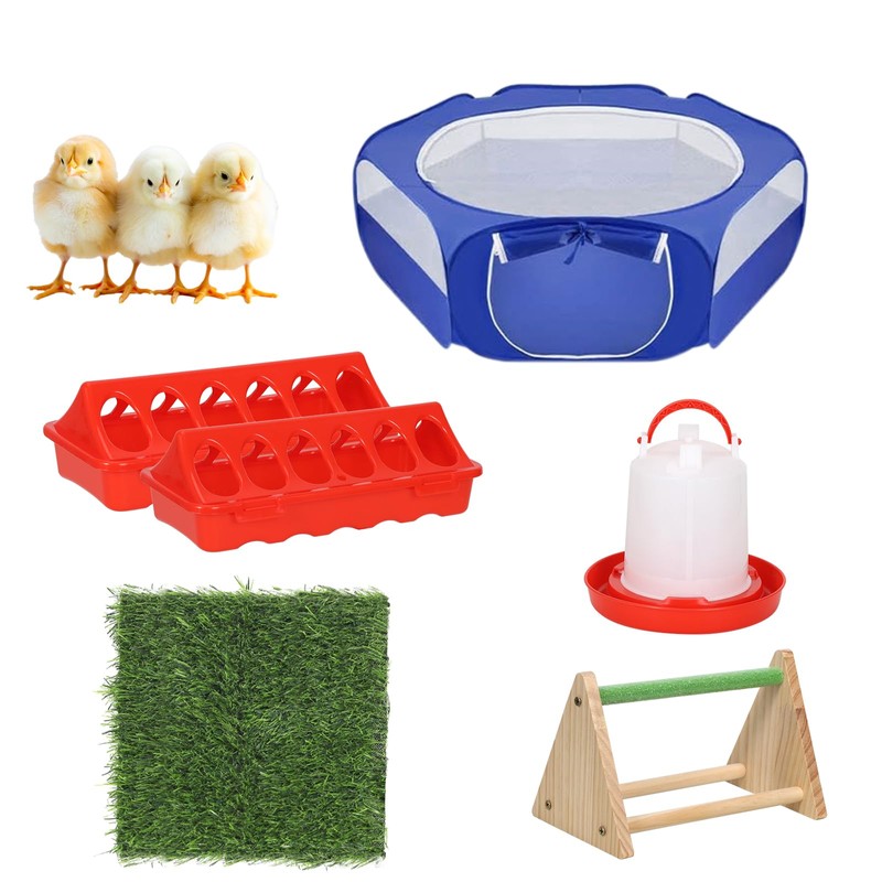 - 【6-In-1 Chick brooder kit】Introducing the comprehensive chick starter kit designed to cater to your needs for raising baby chicks. This complete package includes 1 chicken pen, 1 chicken waterer, 2 chicken feeders, 1 sturdy chicken perch, and 1 cozy nesting pad, ensuring that your chicks are comfortable and well-fed from day one