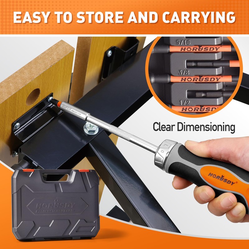 HORUSDY 59pcs Magnetic Nut Driver Set with 6-in-1 Ratcheting Screwdriver Handle, SAE & Metric 1/4 Inch Hex Shank Socket Set for Impact Drill with Quick-release Bit Holder and Extension Bar