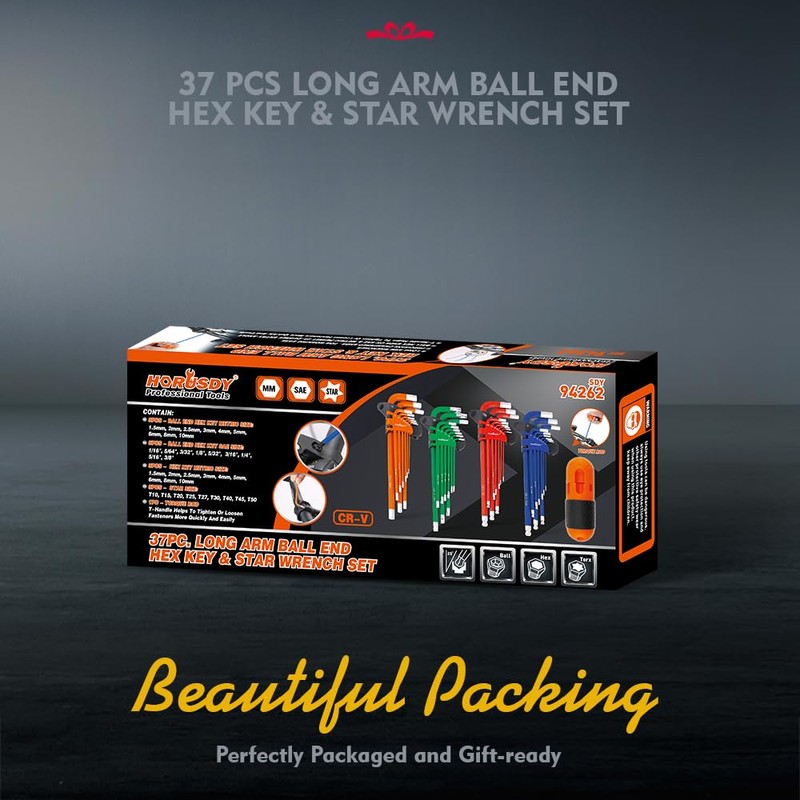 HORUSDY 37PCS Hex Key Allen Wrench Set, SAE & Metric Star Long Arm Ball End Hex Key Set, Industrial Grade Allen Wrench Set with Another Torque Handle