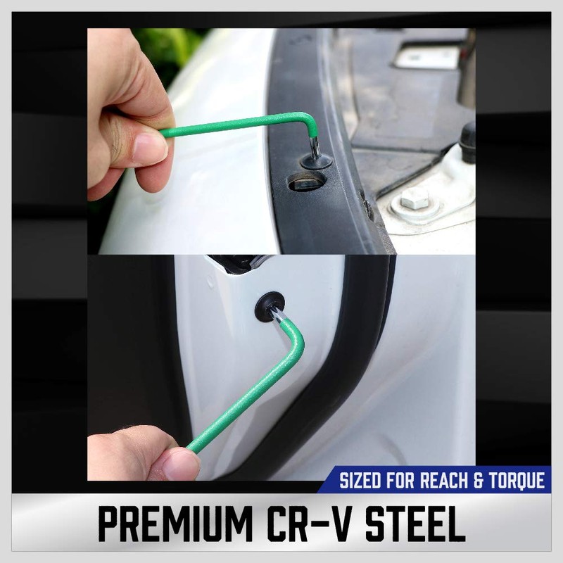 - Each allen key with heat treated & chrome plated also has a different highly visible color to make for easy distinction of different sizes. A textured slip resistant surface for an easy grip even with oily & dirty hands.