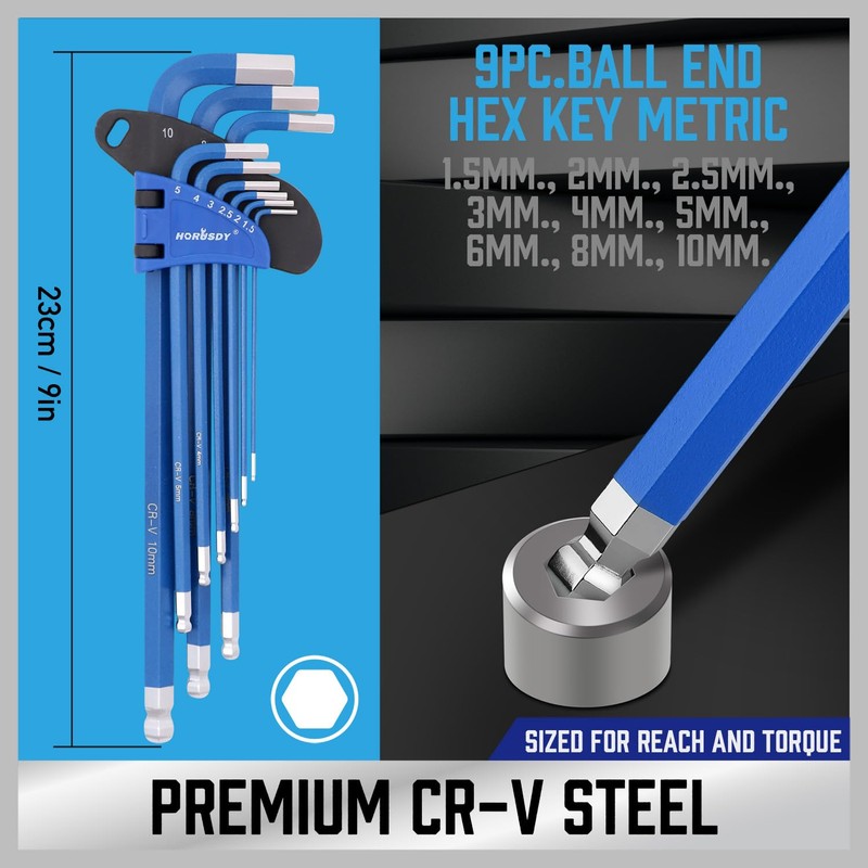 - Complete sizes:9PCS Ball End Metric Size (Blue set) - 9PCS Ball End Imperial Size (Red set) - 9PCS Hex End Metric Size (orange set) - 9PCS Torx Key Star key set (Green set) with another torque handle.