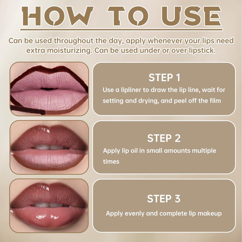 - 【Multi-Usage】Thin application and thick application have different effects. Thin application is glassy lips with a moisturized and refreshing feel; thick application will saturate the lips with color and make them appear fuller. One lip gloss can bring you different makeup experience.