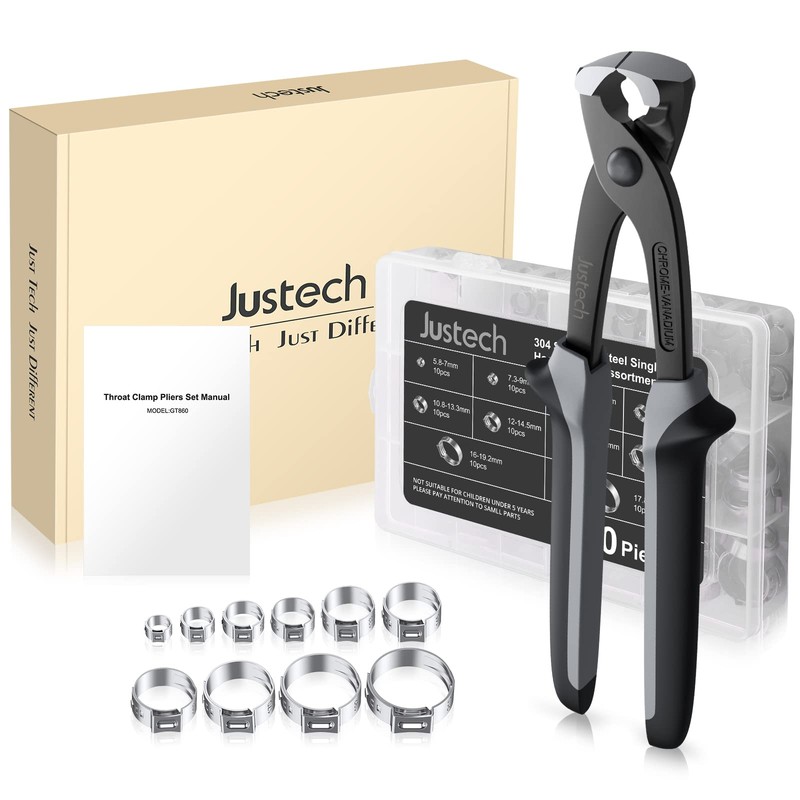 Hose Clip Clamp Justech 100PCs Hose Clips 5.8-21mm 10 Sizes Hose Clamps 304 Austenitic Stainless Steel The Single Ear Stepless Hose Clamp with Clamp Plier Tool