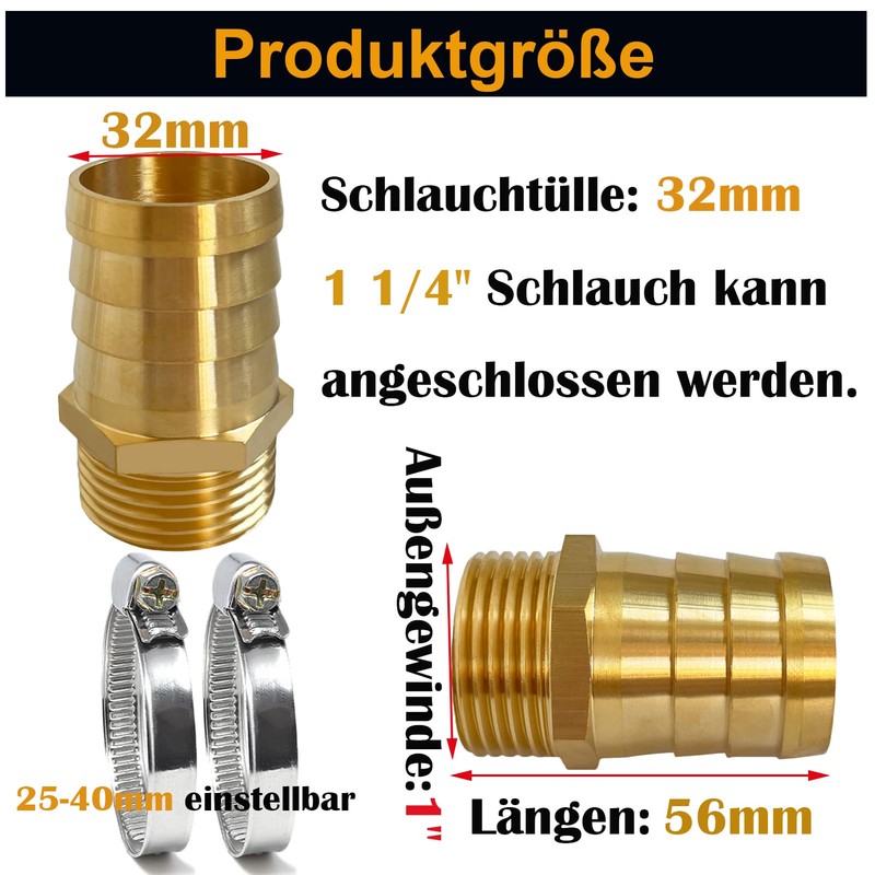 - Specification: external thread: 1 inch (32 mm); hose nozzle: 32 mm (1 1/4 inch), 1 1/4 inch hose can be connected.