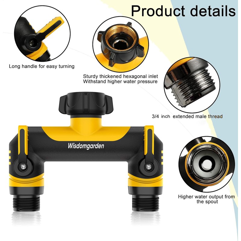 - Wisdomgarden water spigot splitter is the best alternative to setting up extra water outlets. It can connect three hoses at the same time and perform three water-related tasks. Practical and easy to use. Also suitable for home washing machine, dishwasher tap water flow diversion.