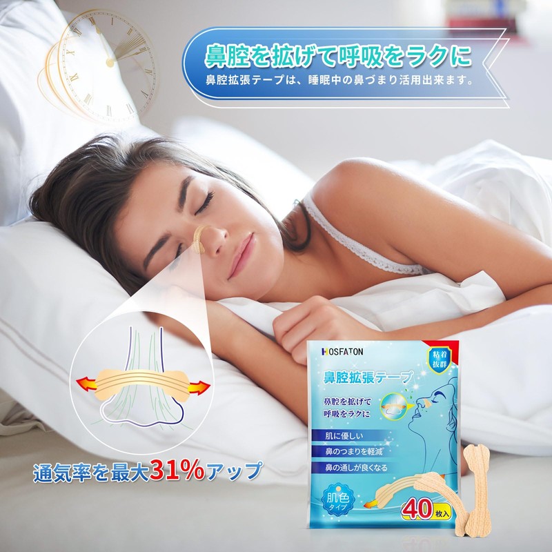 - HOSFATON 鼻腔拡張テープ:内容量(40枚入 × 2個)、サイズ:約66mm×19mm、素材:ポリエステル不織布、無香料・肌色タイプ、鼻腔を拡げて呼吸をラクに!