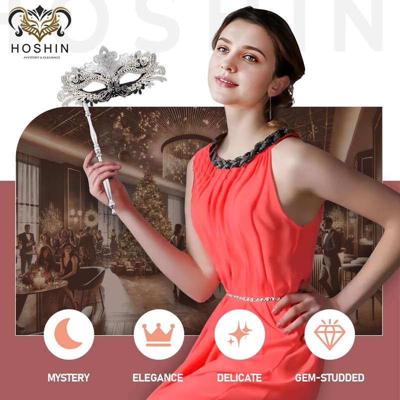 Hoshin Masquerade Mask with Stick, Mardi Gras Deecorations Venetian Masks for Womens (Silver & Black)