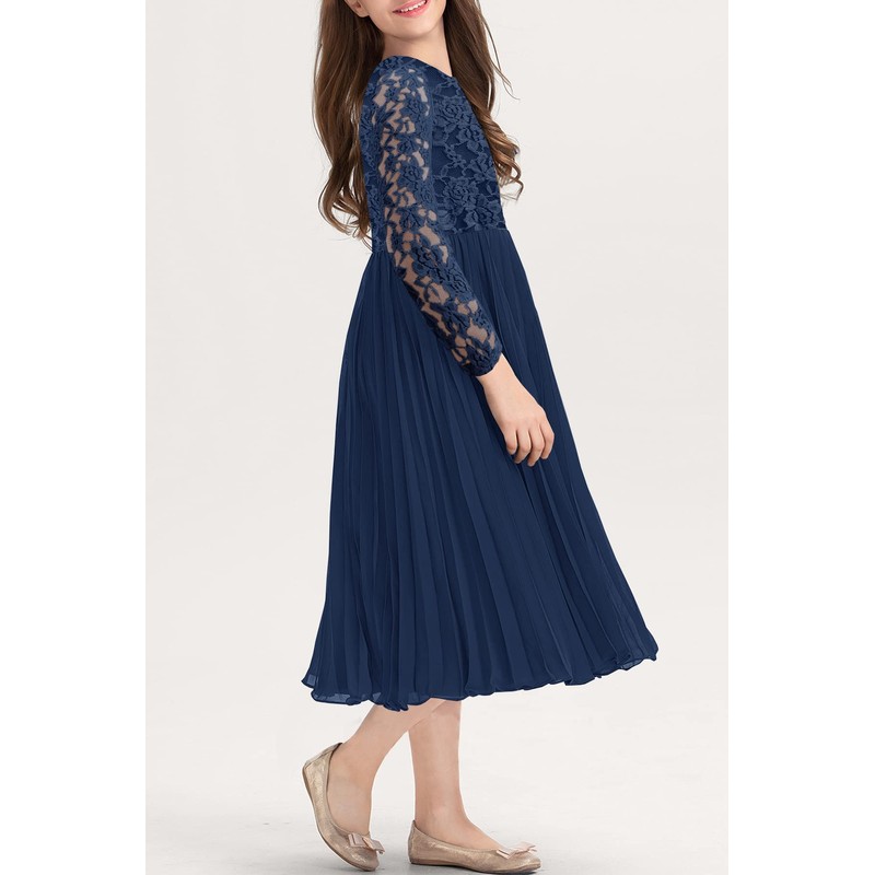 HOSIKA Autumn Girls, Little Kid Kids Lace 3/4 Sleeve Floral A-Line Pleated Casual Party Midi Dress Navy Blue 8 Years