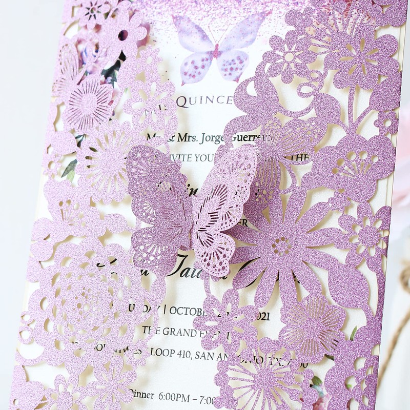 - Purple Glitter Invitations: laser cut hollow lace floral with butterfly inviations, and printable ivory inner sheet with pearlescent. Exquisite design with carved beautiful pattern, looks romantic and elegant. It helps to give your guests a good impression of your party.