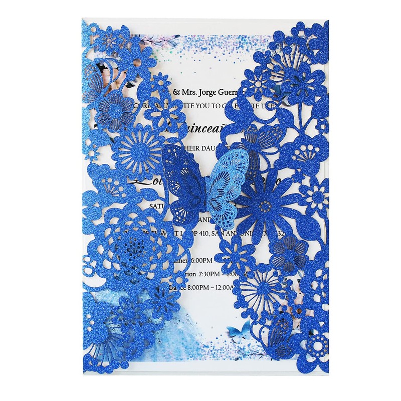 - Royal Blue Glitter Invitations: laser cut hollow lace floral invitations with butterfly inviations, and printable ivory inner sheet. Exquisite design with carved beautiful pattern, looks romantic and elegant.It helps to give your guests a good impression of your party.