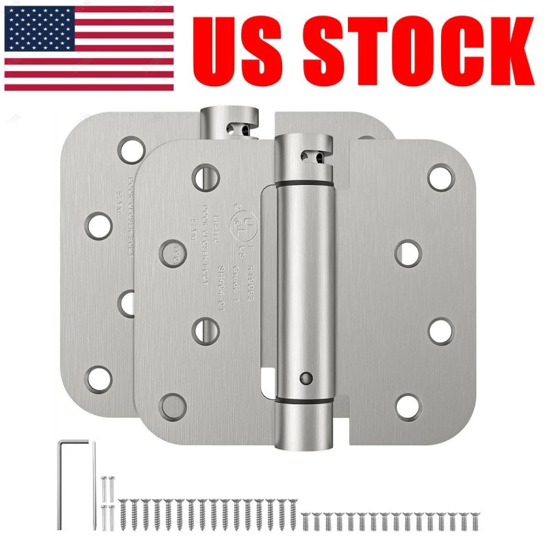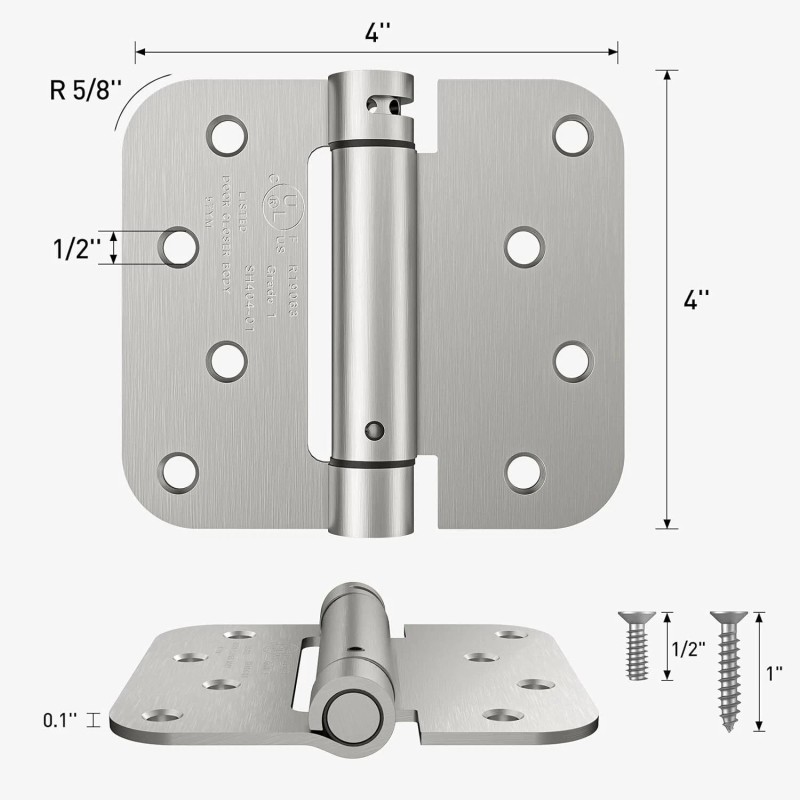 HOSOM Self Closing Spring Loaded Hinges, 4 Inch, Adjustable Tension for Garage, Front, Back Door, UL Listed, Left and Right Hand, 5/8'' Radius Corners, Brushed Nickel, 2 Pack