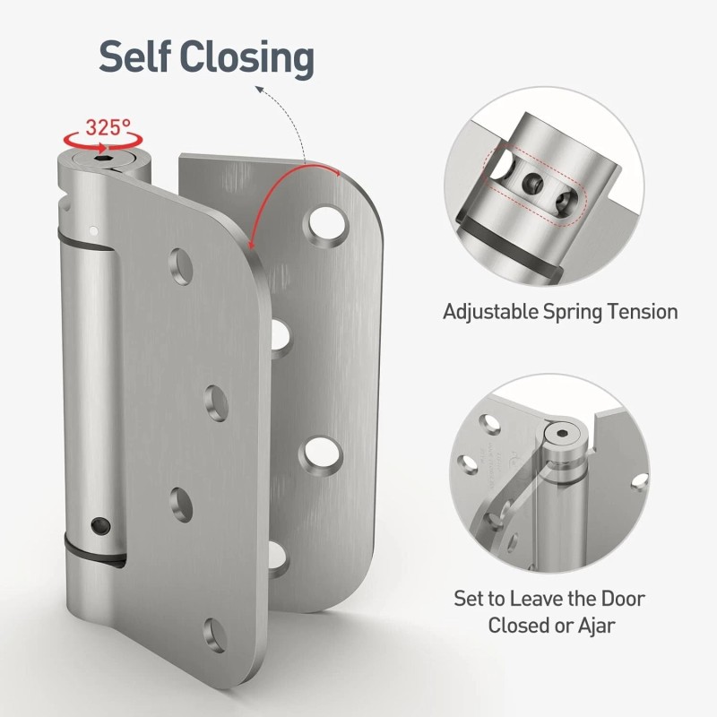 • ?Self Closing?The self closing door hinges are spring-loaded. The closing force is great for doors that people forget to close. Adjustable tension makes you freely set to leave the door closed or ajar.